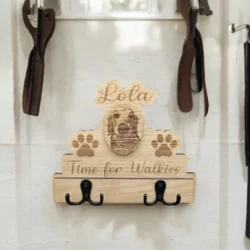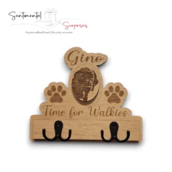 You can add the personal touch by adding an engraved name and photo of your dog. Made out of Oak Veneer with x2 double black metal hooks on the front and x2 picture mountings on the rear, for easy hanging.